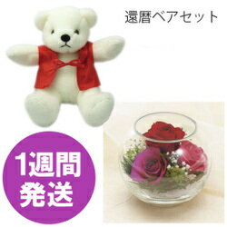 赤いちゃんちゃんこは恥ずかしくてなかなか着てくれる方が少ないようです。それでもプレゼントしたいという方に、かわいいくまさんが代わりに着てくれました!赤いお花のガラスボトルには名前、日付などの彫刻もできます。