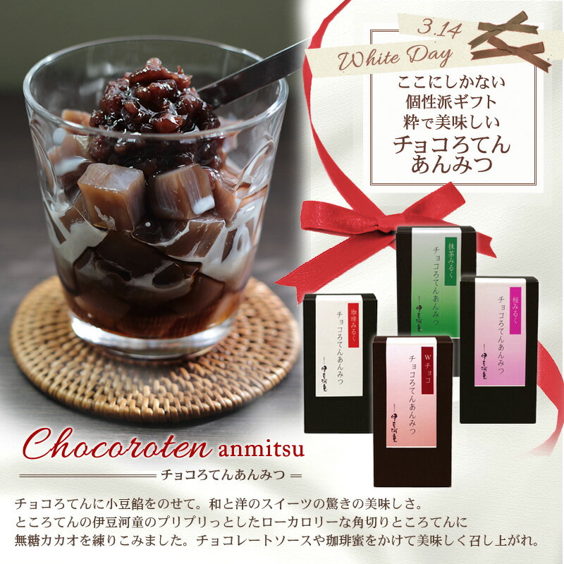チョコレートが苦手な彼に贈るバレンタインはこのチョコろてんあんみつで決まり!ソースは4種類から選べます。他の女の子と差をつけて、彼のハートをキャッチしましょう!
